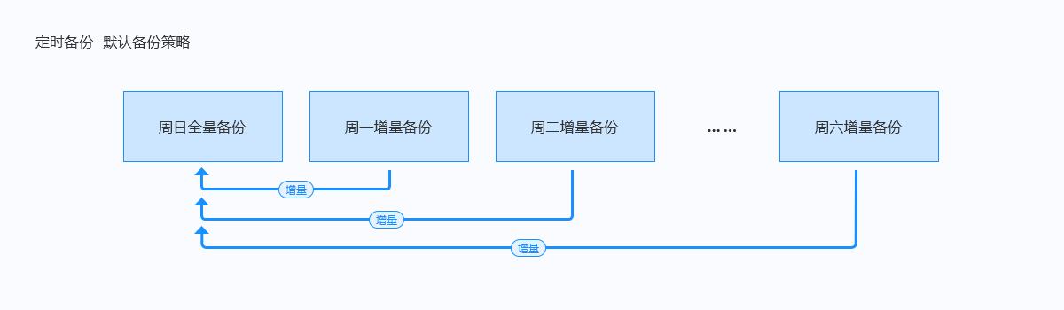 ● 周日备份全量数据,其他时间分别在周日全量备份的基础上做一次增量备份。如此,可通过全量数据和其他任一增量备份数据,快速恢复到指定一天的数据。