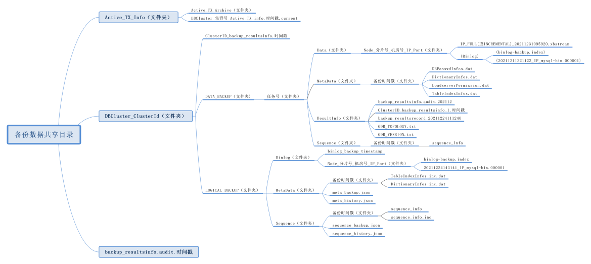 ● “DBCluster_集群ID”文件夹:该目录下存放“DATA_BACKUP”、“LOGICAL_BACKUP”、备份结果记录文件。
