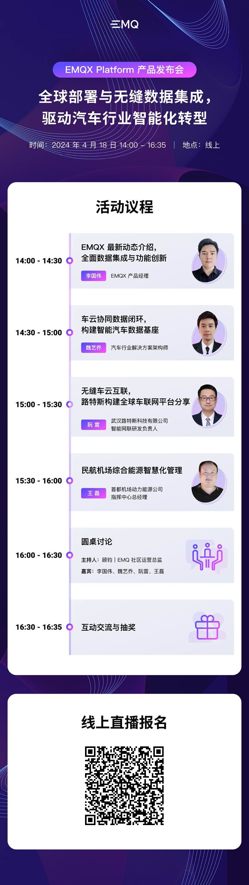 本周四 (4 月 18 日),EMQ 将举办产品发布会,介绍旗舰产品 EMQX Platform 的最新功能与动态。本次发布会荣幸地邀请到了首都机场动力能源公司的技术专家,为大家分享如何利用 EMQX 统一接入平台,构建综合能源管理平台,以智能化的方式管理首都机场集团的各类能源使用。