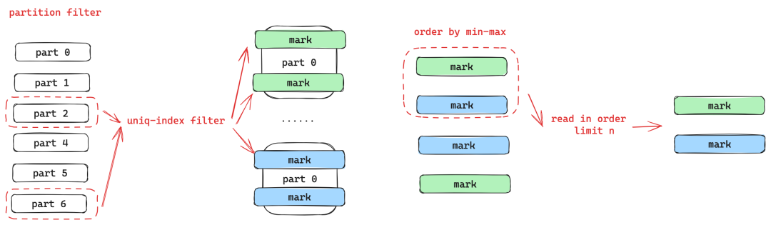 读链路中首先会进行分区的裁剪,和之前主键过滤一样,分区的裁剪里面有大量的表达式的计算,为此ByteHouse做了更轻量的分区的裁剪,并基于分区裁剪和 unique index 的过滤的结果得到 part 和 mark 的值。针对 limit 可以下推的场景,ByteHouse在 mark 的粒度上建了一个 Min-Max 的索引,然后按照 Min-Max 索引做排序就可以通过 limit 值来判断出真正需要读的 mark 是哪些。这样就可以只读少量的mark,不必要读所有筛选出来的 mark 再做过滤。