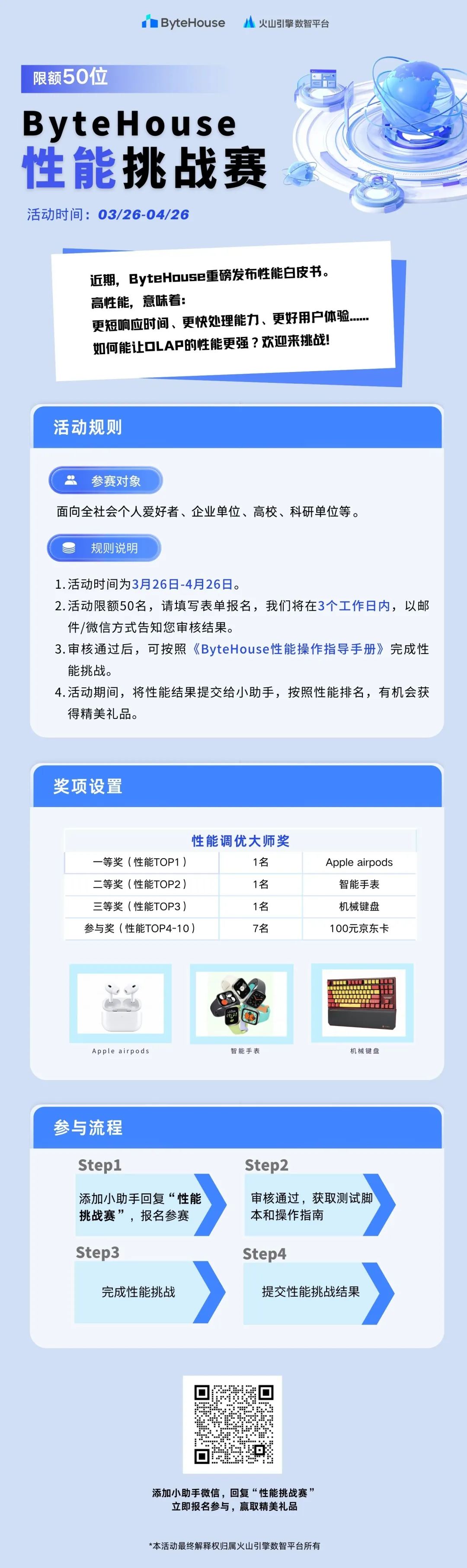 通过一系列技术优化手段,ByteHouse实现性能进一步提升,缩短查询执行时间、优化资源利用,能应对更复杂的查询场景,为用户提供更流程的数据分析体验。不仅仅是探索性能突破,ByteHouse也在持续拓展产品一体化、易用性、生态兼容性,为业务带来更多的价值,推动各行各业数字化转型。