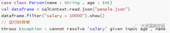 编译时类型不安全:Dataframe API不支持编译时安全性,这限制了在结构不知道时操纵数据。以下示例在编译期间有效。但是,执行此代码时将出现运行时异常。