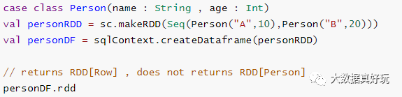 无法对域对象(丢失域对象)进行操作:将域对象转换为DataFrame后,无法从中重新生成它;下面的示例中,一旦我们从personRDD创建personDF,将不会恢复Person类的原始RDD(RDD [Person])。