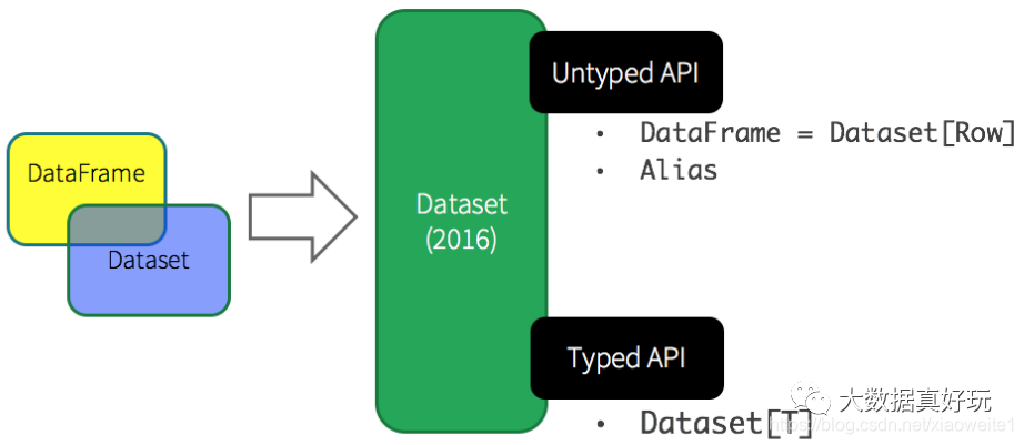从Spark 2.0开始,DataFrame与Dataset合并,每个Dataset也有一个被称为一个DataFrame的类型化视图,这种DataFrame是Row类型的Dataset,即Dataset[Row]。