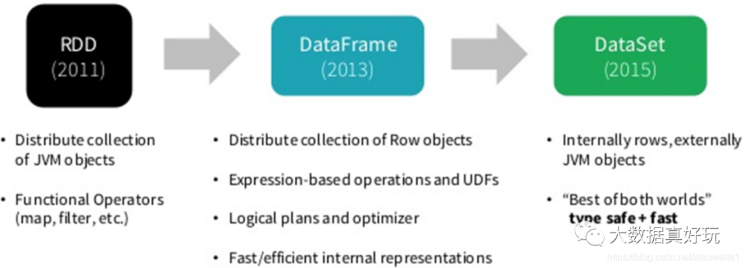 Spark 框架从最初的数据结构RDD、到SparkSQL中针对结构化数据封装的数据结构DataFrame,最终使用Dataset数据集进行封装,发展流程如下。