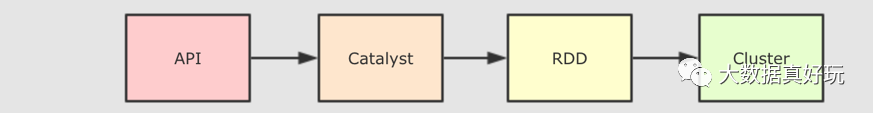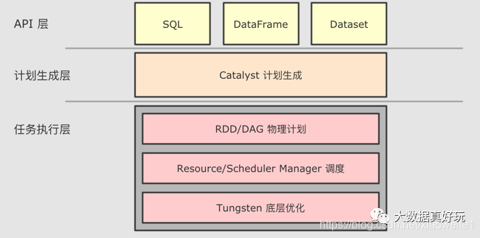 1.API 层简单的说就是 Spark 会通过一些 API 接受 SQL 语句 2.收到 SQL 语句以后, 将其交给 Catalyst, Catalyst 负责解析 SQL, 生成执行计划等 3.Catalyst 的输出应该是 RDD 的执行计划 4.最终交由集群运行