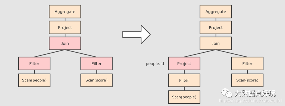 列值裁剪 Column Pruning, 在谓词下推后, people 表之上的操作只用到了 id 列, 所以可以把其它列裁剪掉, 这样可以减少处理的数据量, 从而优化处理速度