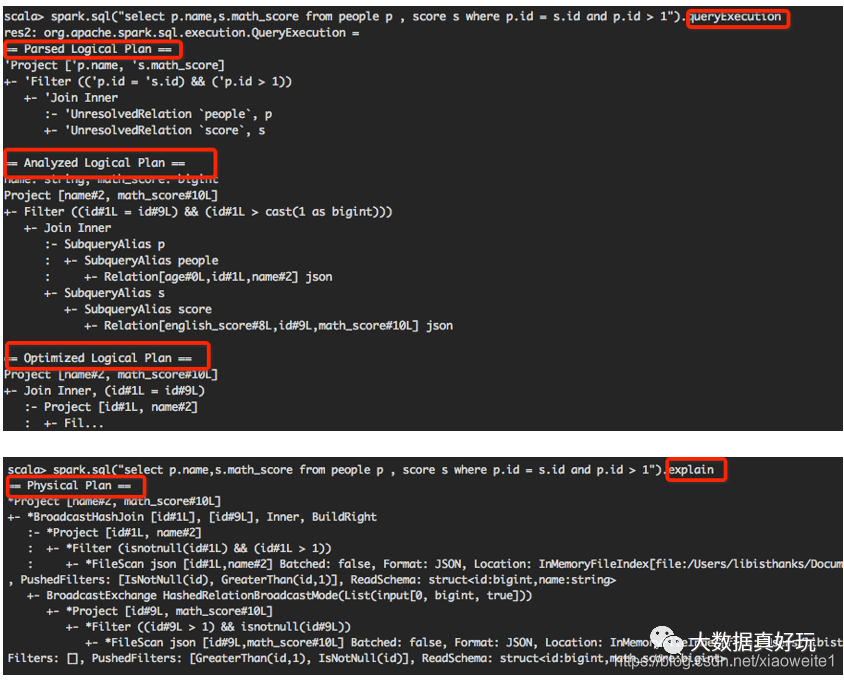 可以使用 queryExecution 方法查看逻辑执行计划, 使用 explain 方法查看物理执行计划。
