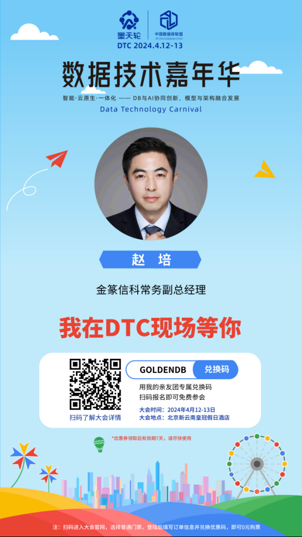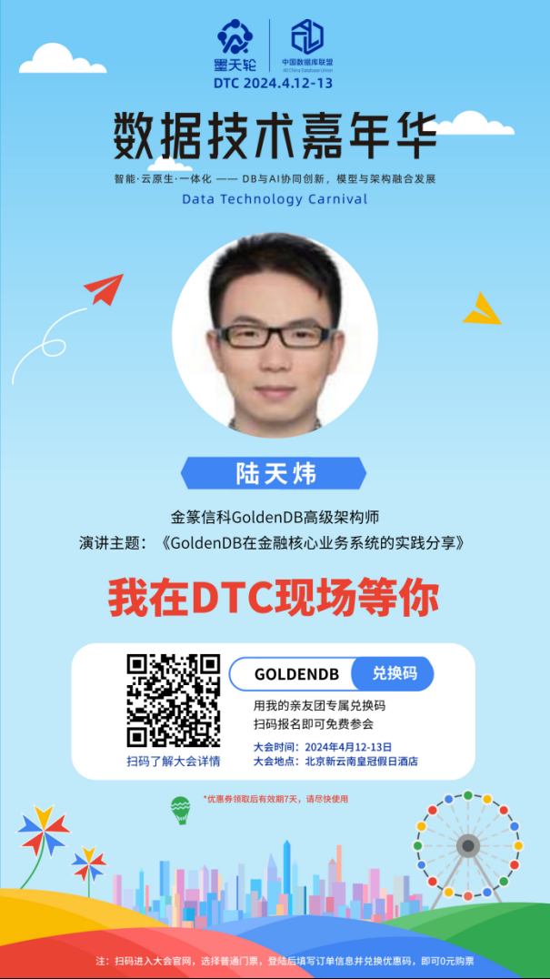0元购票福利:👉进入数据技术嘉年华官网 ( https://www.modb.pro/dtc2024 ),购票时使用专属优惠码【GOLDENDB】即可免费购买普通门票一张,数量有限,先到先得!