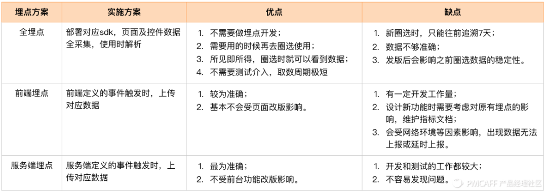 全埋点的逻辑,是指数据采集sdk无区别的,将所有页面的加载成功事件,和控件的浏览和点击事件全部获取后先存下来,到使用的时候,再根据具体的页面路径和控件名称,去捞取相应的数据。基于此,可视化埋点是指,在全埋点部署成功、已经可以获得全量数据的基础上,以可视化的方式,在对应页面上定义想要的页面数据,或者控件数据。这种方案的弊端之一是耗流量和存储空间,全埋点采集的数据一般会根据情况设定一个销毁时限,比如7天。即:全采集过来的数据,如果7天之内没有被使用,则会删除。而一旦对圈选数据做了圈选定义之后,则被定义的页面数据、控件数据,则会一直采集,且不会删除。全埋点,其优势和特点是功能上线时,不需要开发做额外的埋点定义工作,用的时候再根据需求去获取对应的数据,因此也叫无埋点。2)一旦版本迭代,对页面的路径做修改,或者控件位置、文案有修改,原来的圈选数据可能就会出错,需要重新圈选,之前利用圈选指标设定的分析模型都要替换;