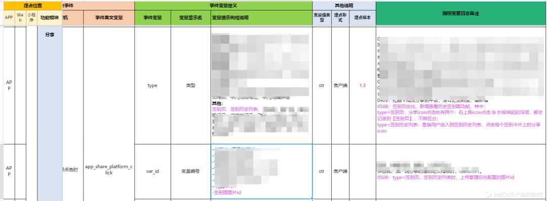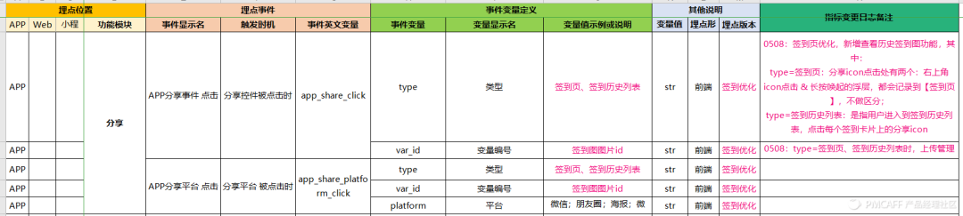 举一例:功能产品对签到功能进行优化,涉及到新增一些页面的分享功能,其最初提交的埋点需求如下图,标红的是分享相关的埋点需求:(数据PM需要要求功能PM按照统一的字段进行埋点的设计,初期的事件定义或者变量定义或许不规范,没关系,这个能力可以随着做几个版本逐步提高,但是字段规范一定要先定义好)在评审这期埋点前,数据PM查看在总表里,有分享相关的埋点:图12:查阅总表,分享事件之前已经有签到功能的埋点根据我们前面提到的原则,类似【分享】这类通用的功能组件,不要重复造轮子,而是要统一到一个事件上,通过类型来处理,因此,针对例子中的功能点,也将其提出的分享埋点,合并到总表中,如下图:然后,功能PM将仅该版本所涉及到的埋点拎出来,单独整理一份埋点文档,这份文档是单独给开发来看的,这样做的好处是:让开发同事只关注这个功能点相关的埋点就可以(我习惯通过颜色标记来进行区分):如果是第一次这样做,需要跟开发说清楚:这份文档里标颜色的,是这个功能迭代中需要新增/修改的点,没有在文档里看到的type类型的埋点,不是删掉,而是不要动(曾经有位憨厚的小哥,因为没沟通清楚,认为不在表格文档里的,都是要删了的,删了一半了,才找我沟通......)。关于版本迭代中的埋点管理,相比于excel一定要更好的工具化的管理办法,之前跟一个同行聊过,他们采用的方案是,做一个web端平台,可以看到所有的埋点。同时,功能PM可以在该平台上按照字段要求提交自己的埋点需求,然后走审批流程,能够进入开发的埋点,会打上版本标记,待上线后,对应的埋点会出现在平台总表里,供使用者查看。这个方案就很不错,本来计划推这套平台,后来我因个人原因离开了这家公司,就没有再继续。上面这个方案适用于有一定体量的公司,个人认为在C轮之前的公司,大多都是没有精力去做这样一套数据指标管理平台的。埋点有了,能采集到之前获取不到的数据了,下一步该如何使用,下面是从我的经验总结的,数据从浅层应用,向深层应用传递的应用场景。