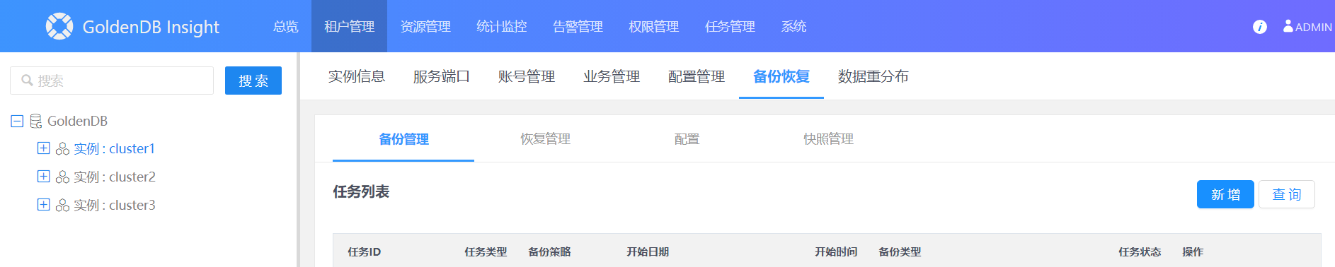 1.在首页选择菜单[租户管理→集群实例→备份恢复→新增→定时备份],进入定时管理页面。