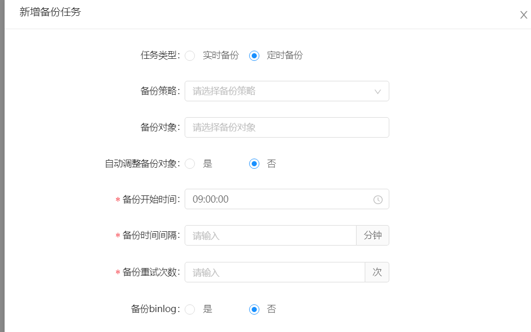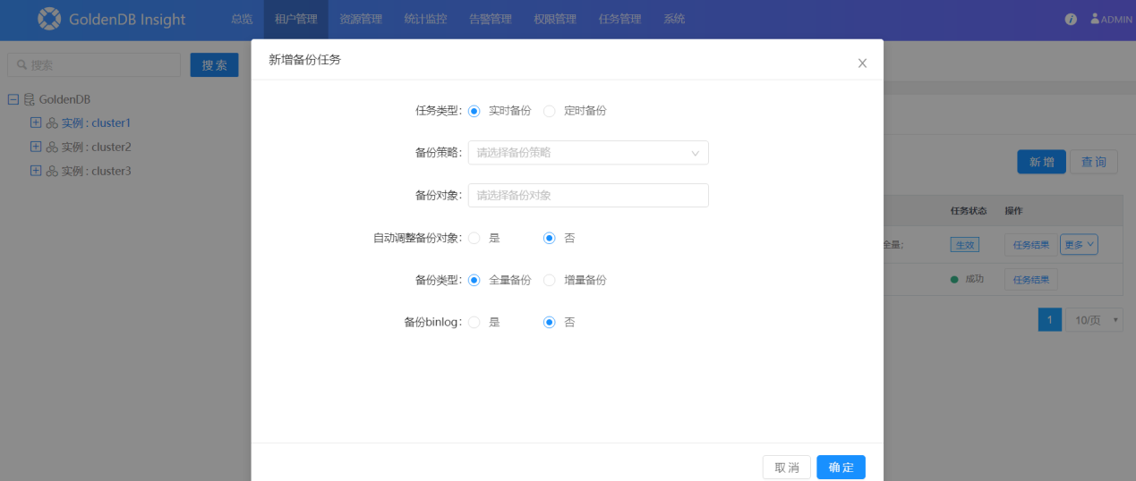 在首页选择菜单[租户管理→集群实例→备份恢复→BINLOG备份→新增],进入新增binlog备份管理页面。