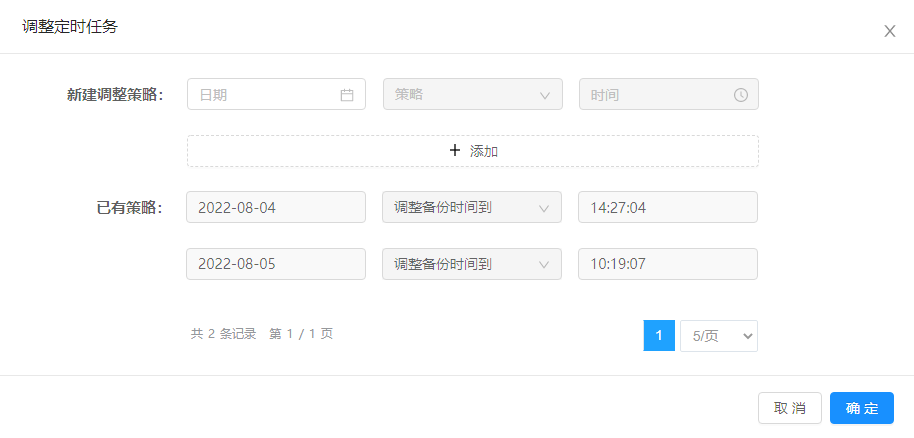 每天只能存在一个策略,且只能调整到未来时间,不能调整到过去时间,调整策略包括取消备份、调整备份时间和取消当天的调整策略。该策略只是对定时备份计划的调整,只有当天有定时任务才可调整。