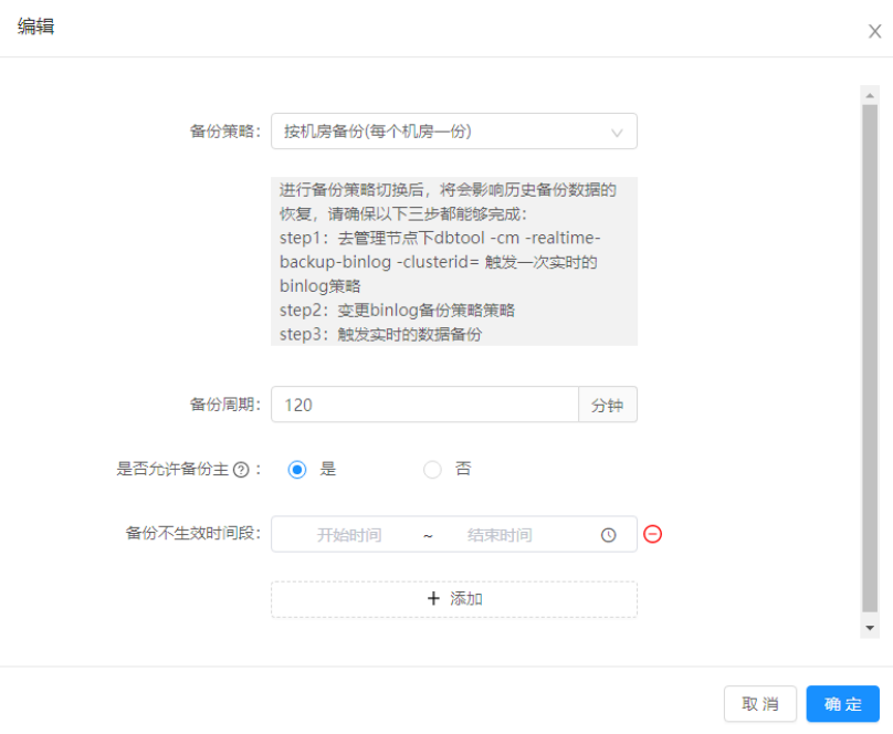 备份不生效时间段 | 可配置binlog备份无效期,在所配时间范围内,不做binlog定时备份,最多可配10段。例如:09:00:00~11:30:00,13:00:00~15:00:00。 |