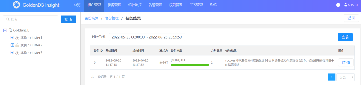 3.备份结果不仅仅展示在命令窗口,也展示在 Insight界面的备份历史记录页面中,发起方显示为命令行,若是从界面触发的备份,发起方显示为管理后台。
