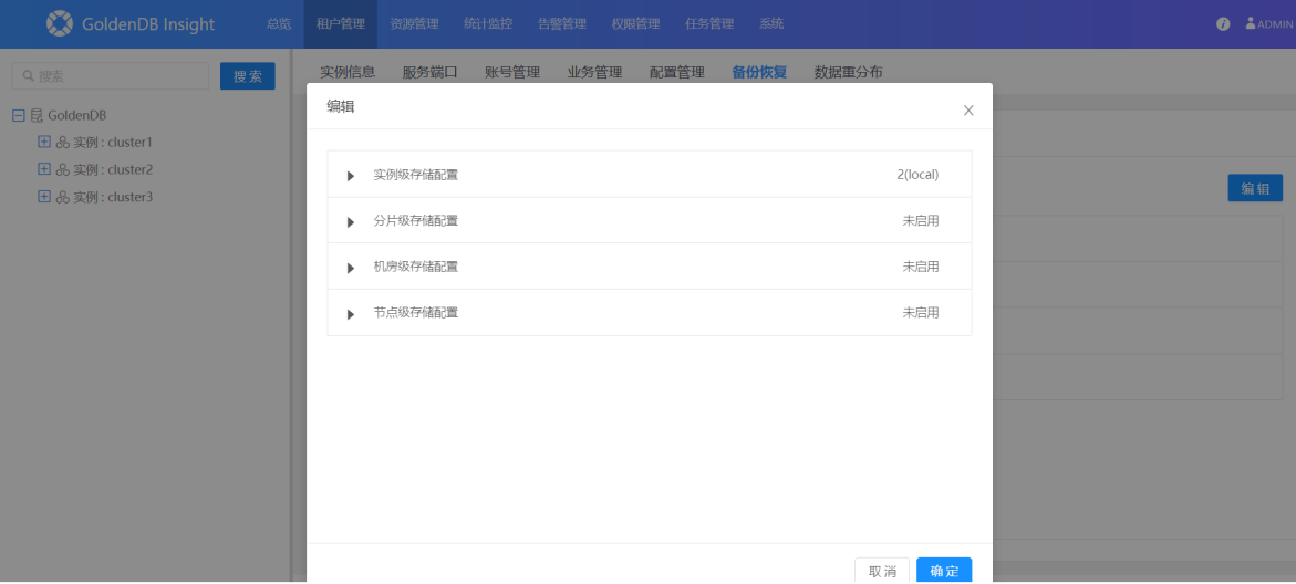 然后在(租户管理→集群实例→备份恢复→配置→编辑)指定使用的存储配置,注意实例级存储配置必须配置,MDS和GTM使用实例级存储配置,数据节点可以使用实例、分片、机房、节点级存储配置,根据需要配置。