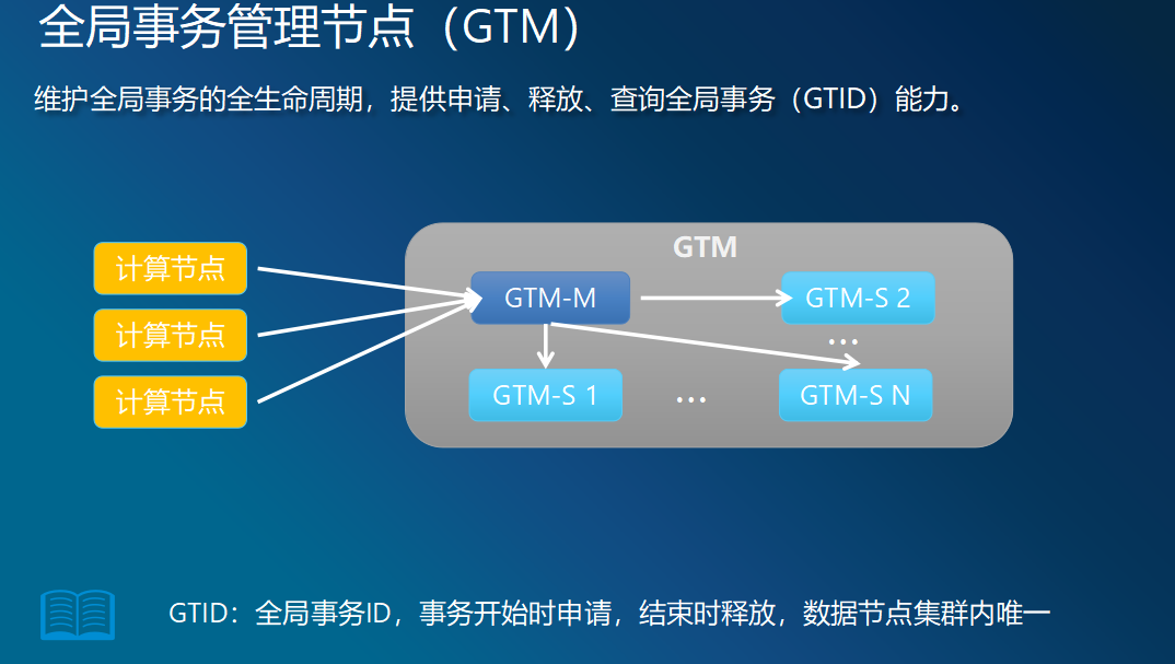 全局事务管理节点:(GTM:Global Transaction Manager),它是协调CN一起进行分布式事务的并发控制的,管理分布式事务的生命周期,负责维护一张当前所有正在执行的分布式事务列表。