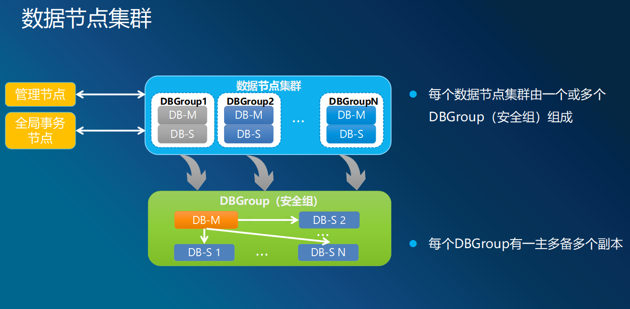 数据节点(DN:DataNode):是用于存储业务数据,及执行分布式子事务的节点。通常一个集群包含多个数据节点,每个数据节点都是独立自治的数据库系统,一个业务的数据只会落到一个数据集群中。业务的数据会被水平的切分后分布在若干个数据节点上,为了保证数据的可用性,我们会为每个数据分片部署多个数据备份节点,假如一个业务的数据分成了2份,如果1号分片坏了,1号分片的备份系统就会替代原分片。因此,数据分片节点和它的备份数据节点构成一个安全组。也就是虚线框住的数据节点。