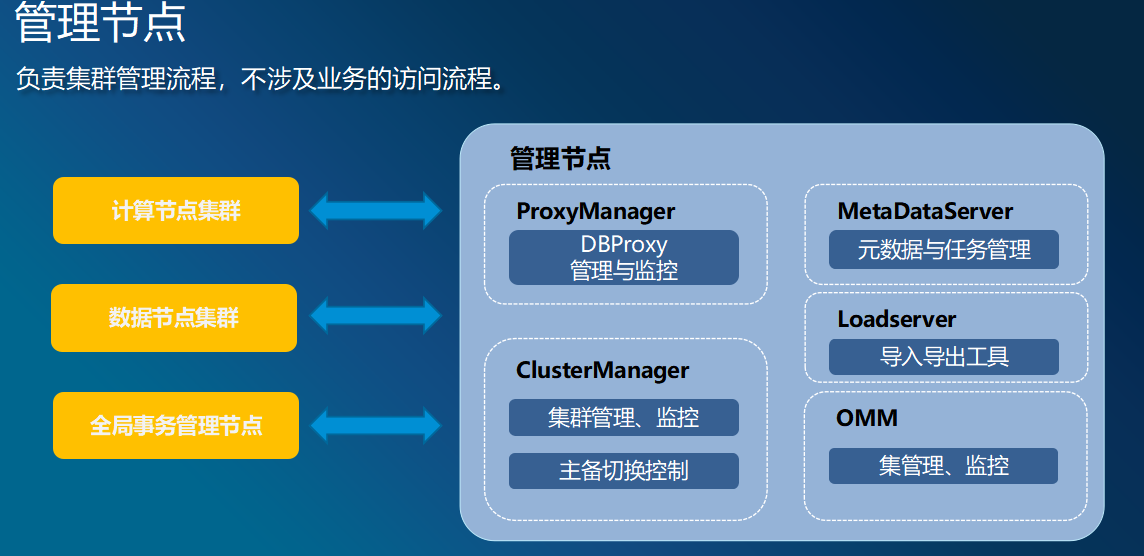 管理节点:是对系统计算节点集群、数据集群管理的节点,它承载了分布式数据库系统的所有的运维操作,包括集群高可用高可靠的管理、系统的备份恢复、系统元数据管理、数据迁移等操作。