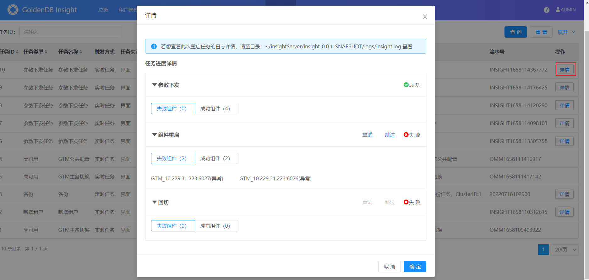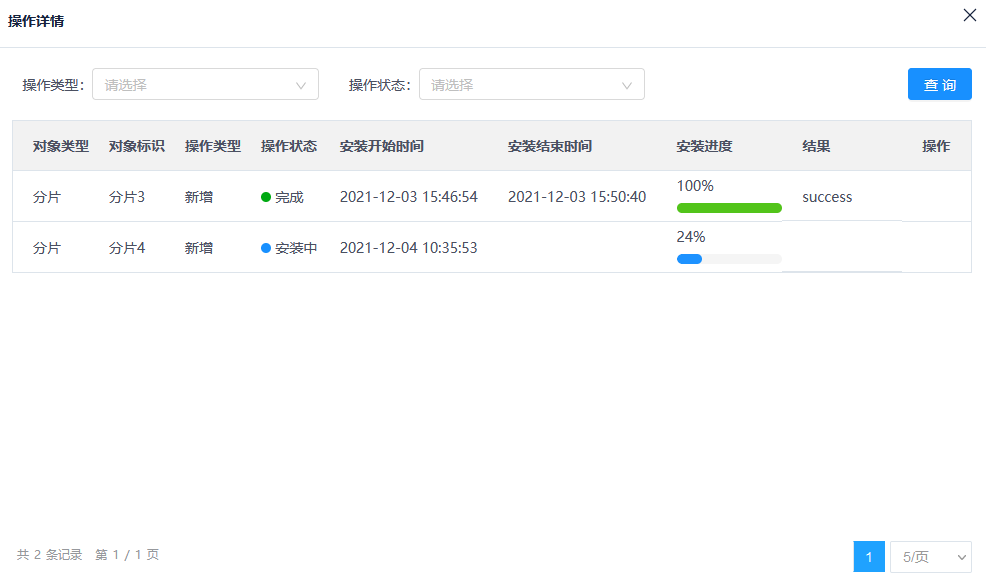 6.单击操作详情按钮,弹出操作详情窗口,可查看DN的管理操作结果。