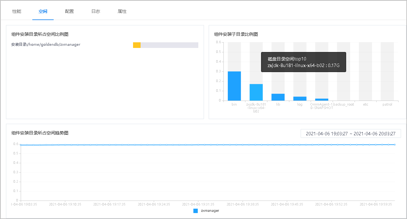 空间页面显示了该组件占用空间大小,以及各个子目录的大小,鼠标放在图表上将显示具体数据信息。