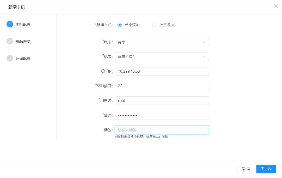 3.选择单个添加方式,在城市与机房处选择机房管理页配置的相关信息,输入主机的IP、SSH端口号、用户名及密码,单击下一步按钮。