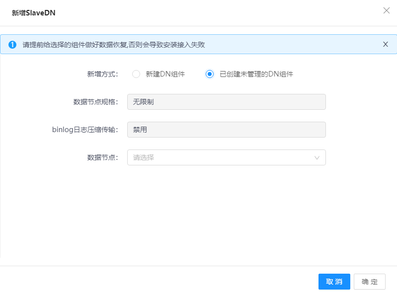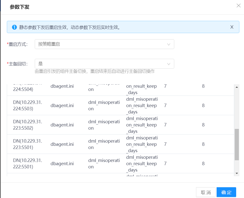 重启DN | 1)在待管理DN行,单击更多,选择重启,弹出操作确认窗口。 2)单击确认按钮,重启DN。 |