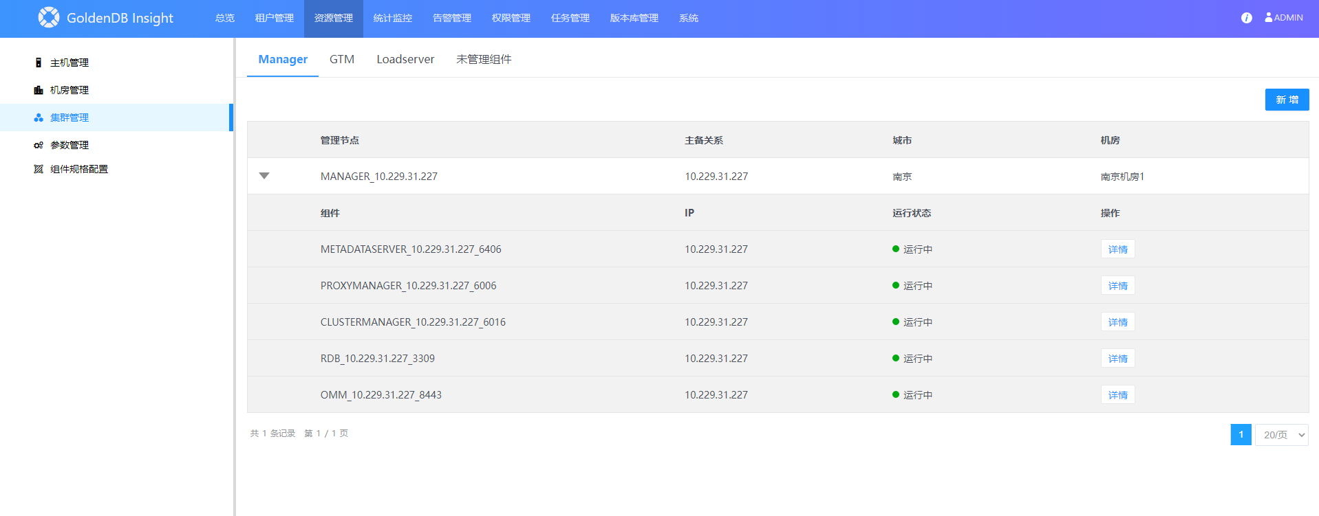 集群管理页面可查看管理节点、GTM、LoadServer的运行状态及详情。