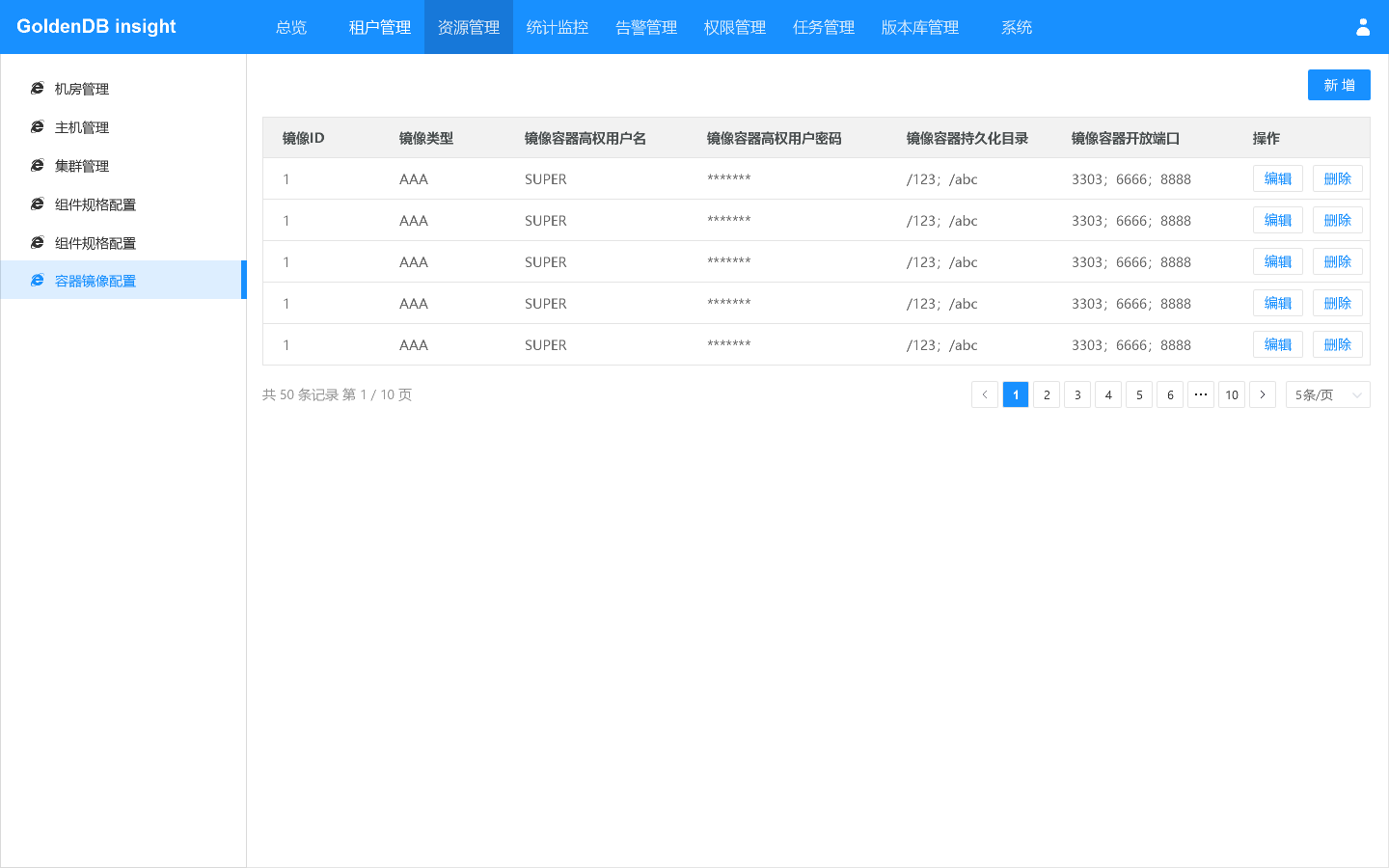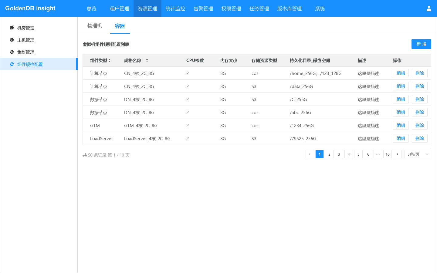 在主机管理界面,可查看GoldenDB使用的主机信息,可对主机执行新增、编辑、删除操作。