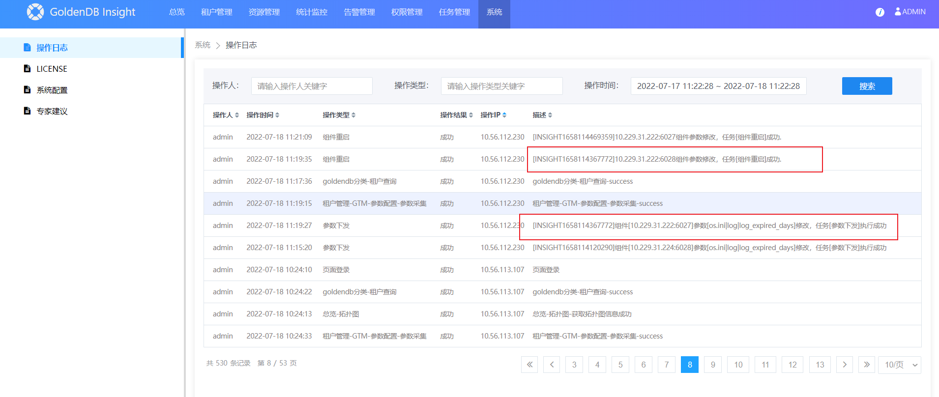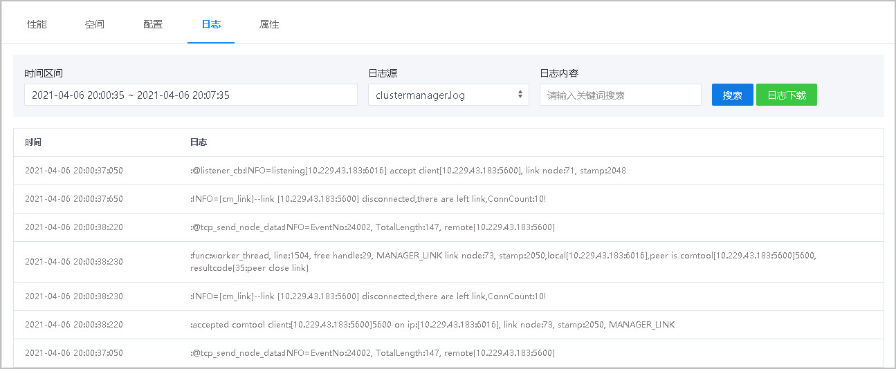 日志页面显示了该组件近一小时内的日志信息,该页面可以通过选择时间区间,查看不同时间范围内的日志信息,同时也支持对关键词进行搜索以及日志下载功能。