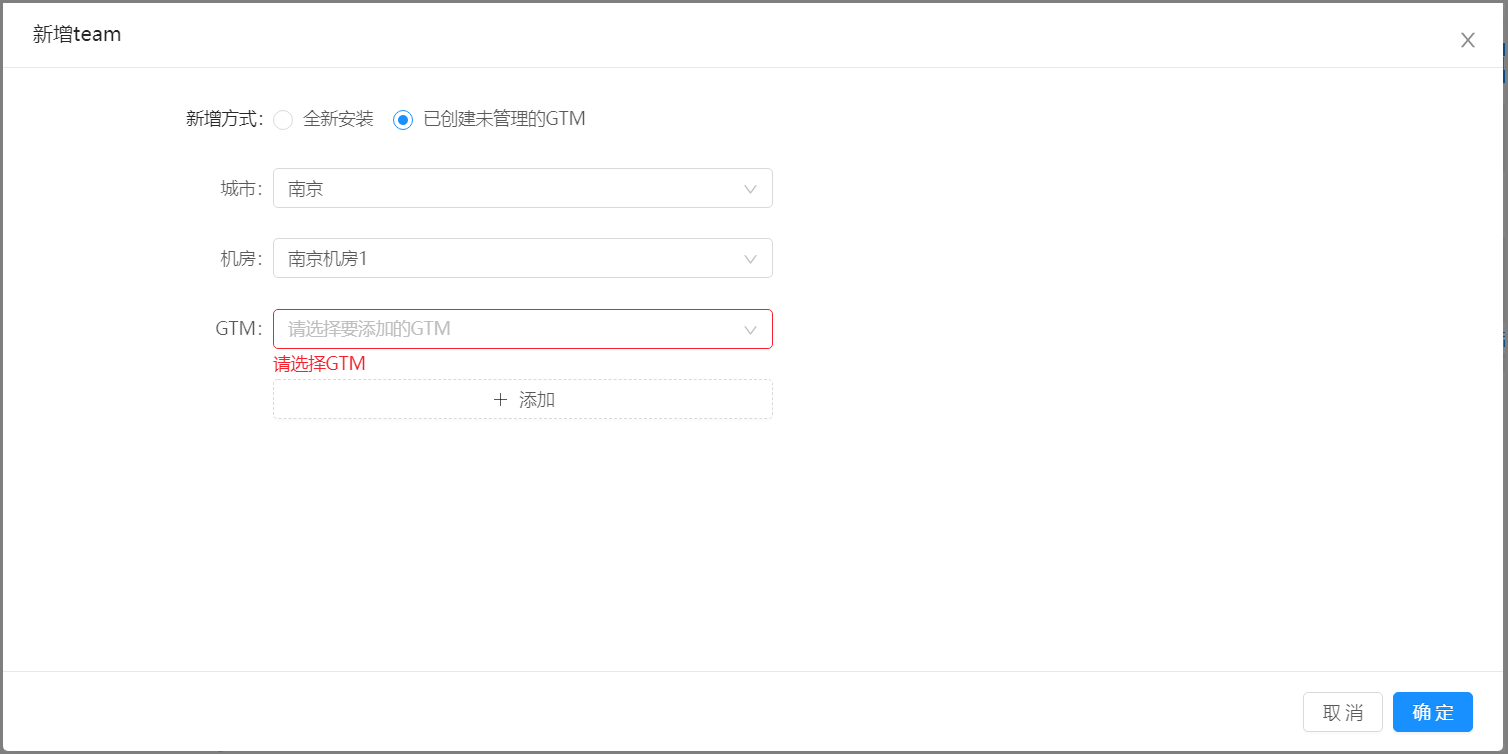 5.在待管理Team所在行,单击新增GTM按钮,弹出新增GTM窗口。