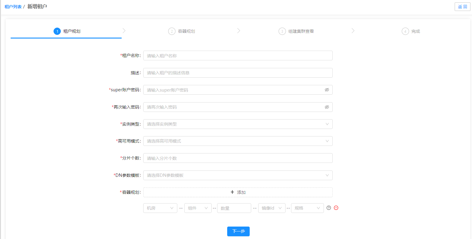 2.单击[新增租户→物理机新增]按钮,进入新增租户界面。