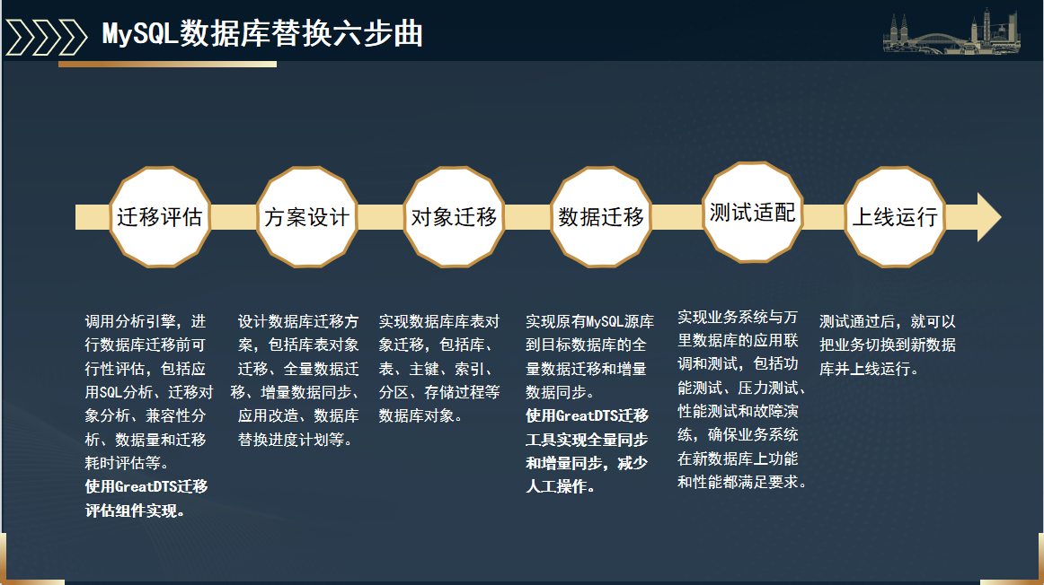 此外,针对金融行业广泛应用的开源数据库MySQL,万里数据库基于MySQL技术路线深耕16年技术成果与经验,打造了一站式MySQL替换解决方案。通过迁移评估、方案设计、对象迁移、数据迁移、测试适配、上线运行六步曲,帮助客户在满足信创要求前提下,无需修改业务系统,即可实现数据无缝、平滑迁移,在保证速度快且安全性最高的同时,还能将应用改造成本降至最低,做到降本增效。
