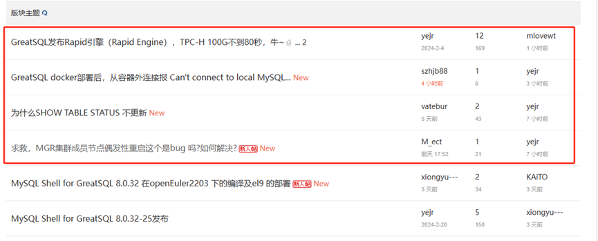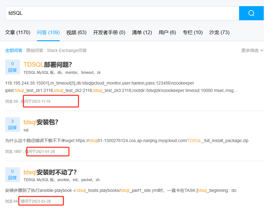 两者比较相似,都是依赖云社区,关于数据库的问答并不活跃,尤其是TDSQL,搜索相关问题大都为2023年以前零星几个。