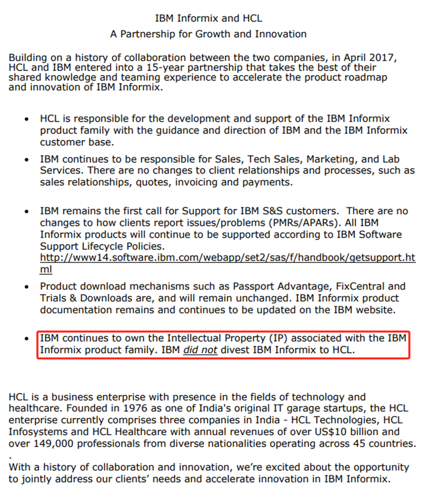 国内3家企业花了钱也仅仅得到了有限时间的代码授权。而2017年5月,IBM把整个Informix业务全都卖给了印度公司HCL。HCL全面接管IBM Informix,不仅仅是代码,而是全部的研发团队、办公场所。