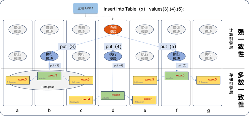 如上图有a,b,c...g共7个节点的crdb集群,根据无中心的特性,应用可以连接任意节点,发送SQL请求。