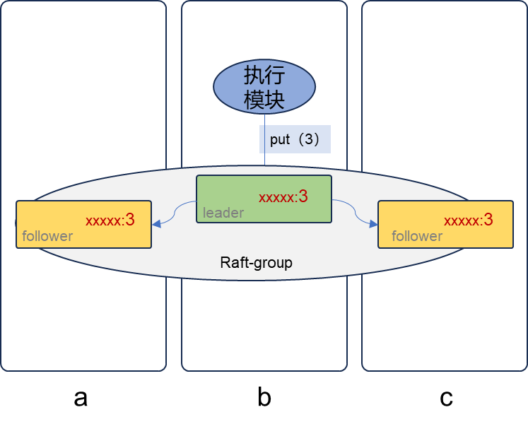 用其中节点b执行put(3)做示例,执行模块向对应的切片leader(副本)发送写入请求,leader接到数据写入时,会判断这行数据操作是否存在冲突,不冲突那么他就将数据写入本地存储中。