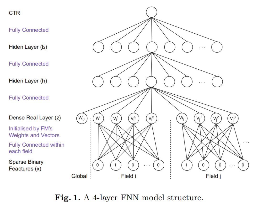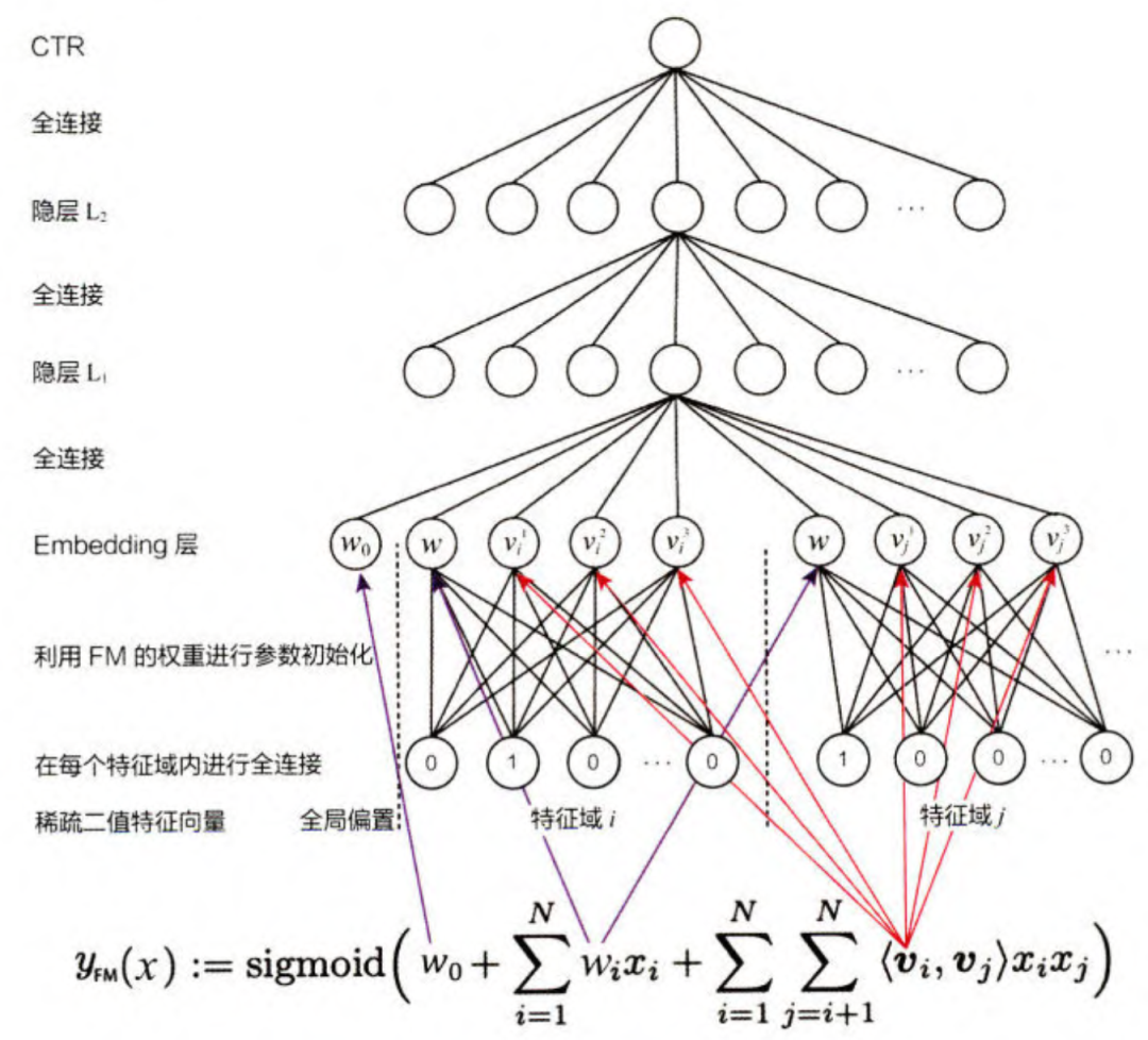 而FNN直接将训练好的FM的权重(一阶特征权重+隐向量)拿了过来,作为自己的Embedding层的初始化权重。