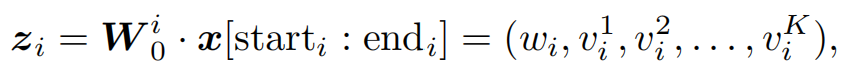 和代表第个特征域中不同类别数,假设为,的维度为,两者做矩阵乘法得到一个长度为的向量,正是.