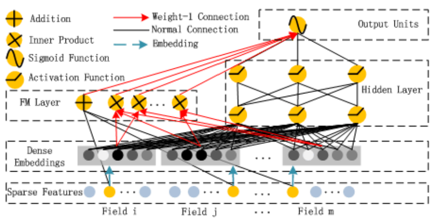 结构很简单,在底层将多个特征域中的稀疏向量进行了Embedding,然后将Embedding的结果输入到全连接层进行特征交叉,最后输出预测结果。