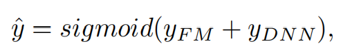 将FM部分和Deep部分的输出结果加起来,经过Sigmoid映射得到最终的预测结果: