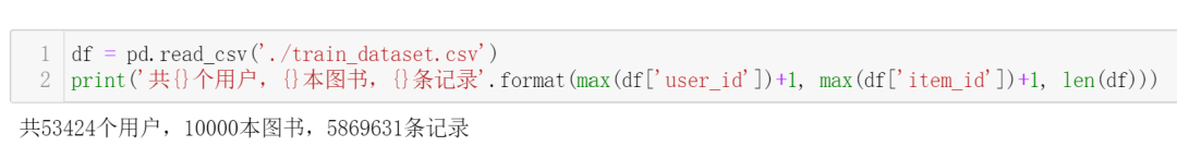 训练集中存储了用户与图书之间的交互信息,比如第一行: (user_id=0, item_id=257) 表示id为0的用户曾经阅读过id为257的图书。