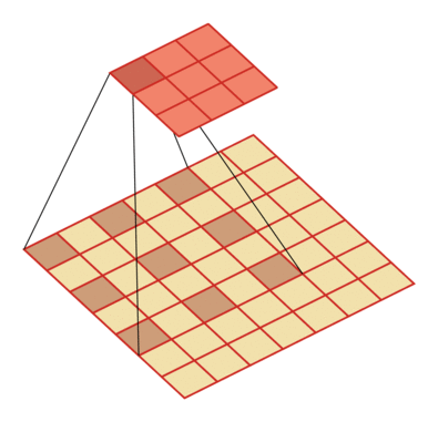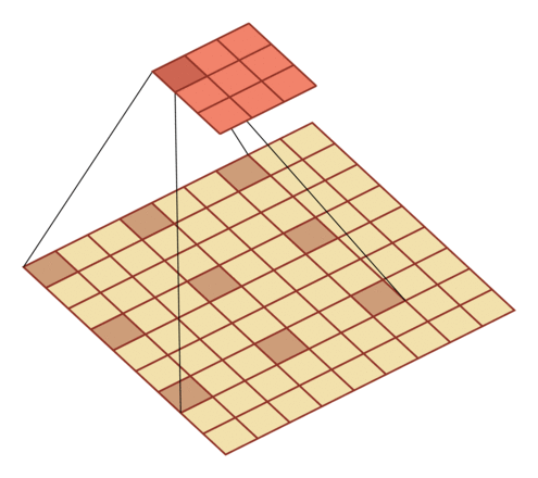 膨胀率为D时,在尺寸为K的卷积核每两个元素之间插入D-1个空洞,于是卷积核的尺寸实际上变成了K+(K-1)*(D-1).