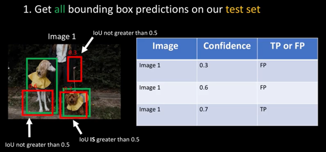 #对于每个预测框,先找到它所在图片中的所有真实框,然后计算预测框与每一个真实框之间的IoU,大于IoU阈值且该真实框没有与其他预测框匹配,则置该预测框的预测结果为TP,否则为FP