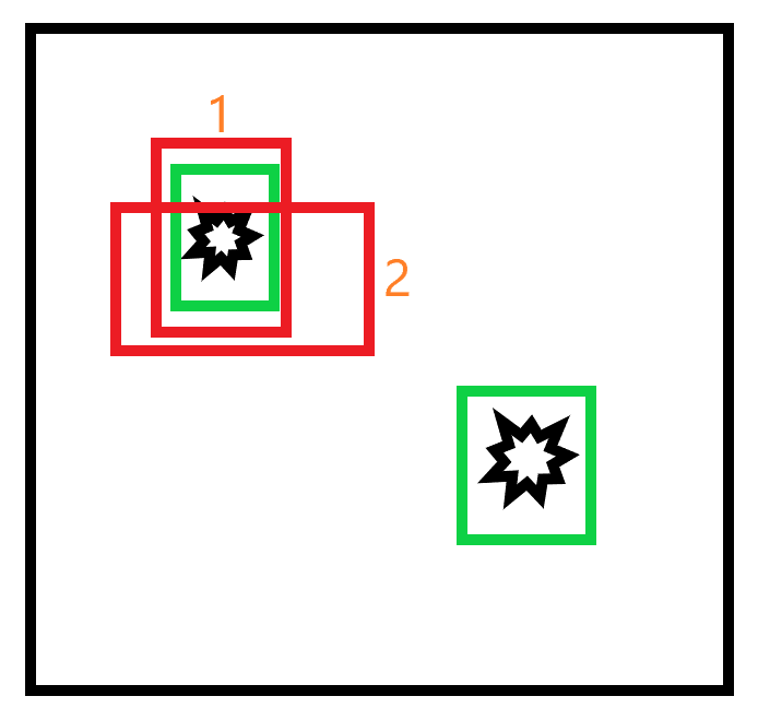 为什么需要这样做?举个例子:下面的绿色框为真实框,红色框为预测框。假设1号预测框已经与左上角的绿色框匹配,那么对于2号预测框来说,它会分别计算自己与左上角以及右下角的两个真实框之间的IoU,虽然结果是它与左上角的真实框之间的IoU更大,但是左上角的真实框已经与1号预测框匹配,因此2号预测框就无法再与左上角的真实框进行匹配了。上述代码保证了这一点。