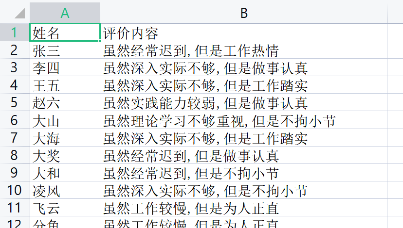 既然是评价他人,无非就是总结一下优缺点嘛,那我搜集一些表达优点的句子,再搜集一些表达缺点的句子,将它们随机组合起来不就成了。就像这样: