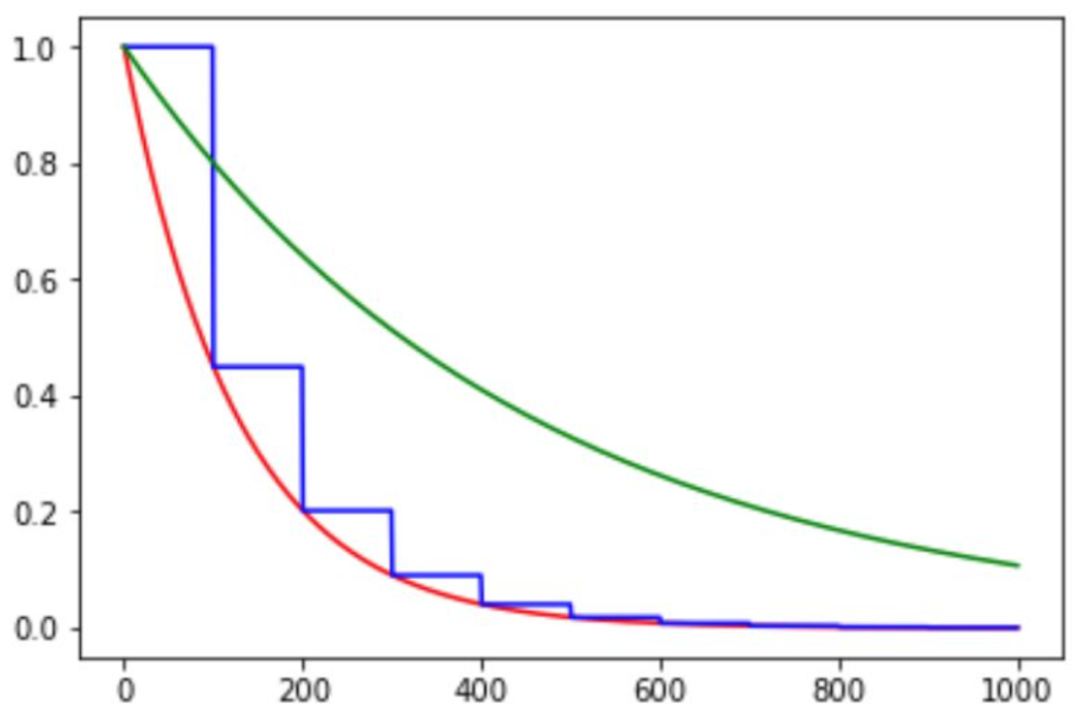 和分段常数以及指数衰减相比,其中绿色的是自然指数衰减。