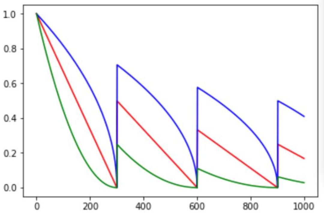自然指数衰减和指数衰减方式相似,不同的在于它的衰减底数是,所以它的收敛的速度更快,一般用于相对比较容易训练的网络,便于较快的收敛,其更新公式为:
