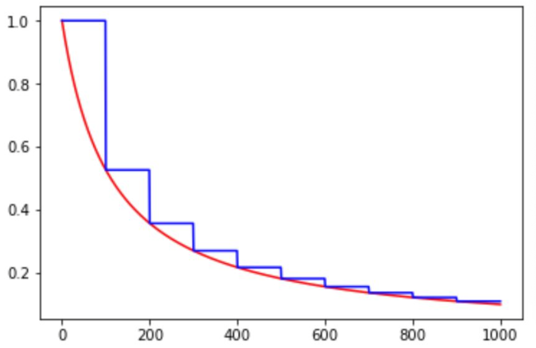 如下图所示,红色的为学习率随训练次数的指数衰减方式,蓝色的即为分段常数衰减 。